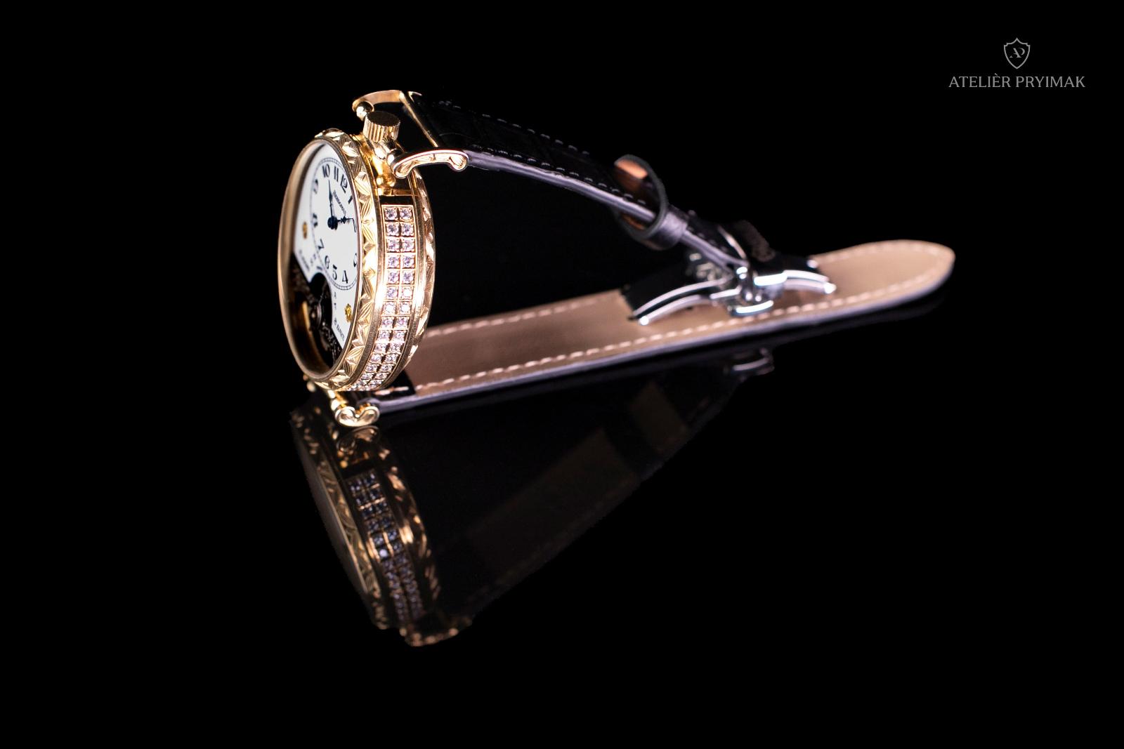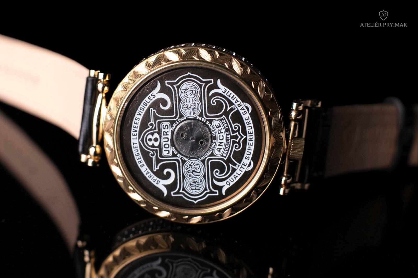 Especially for this collector's item, a 48 mm diameter jeweler's brass case was hand-cast in our studio, inlaid with red zircons and decorated with precise hand engraving according to old Bohemian traditions. The surface of the case was subsequently treated with gold plating, which enhances its luxurious appearance and historical uniqueness.