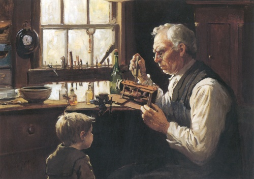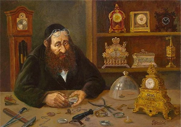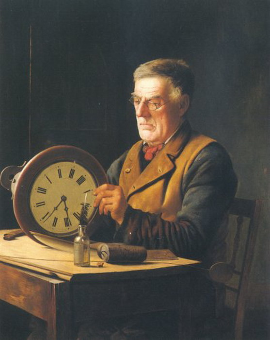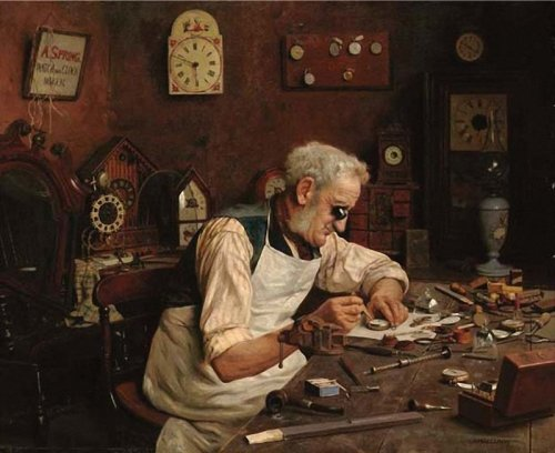 Nejčastěji je zobrazován starší muž s plnovousem, nosící lupy, sedící u pracovního stolu. Jeho postoj je soustředěný, výraz tváře zamyšlený. Je ponořen do jemné mechanické práce a každý pohyb vyjadřuje klidnou koncentraci. Není jen technikem, ale osobou, jejíž život se točí kolem mistrovství měření času.