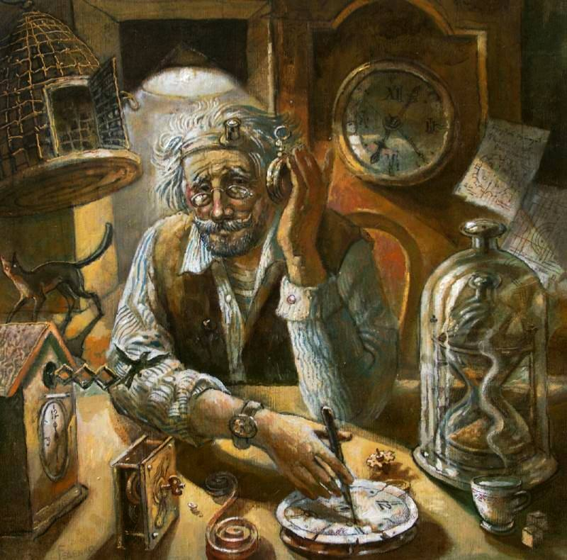 Mimo realistické zobrazení získává postava hodináře symbolické významy: