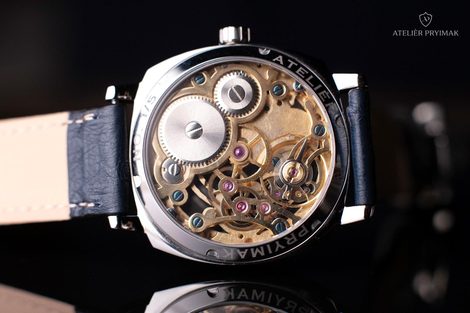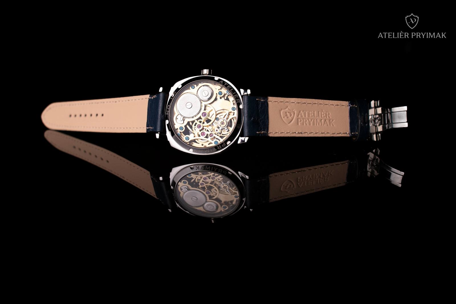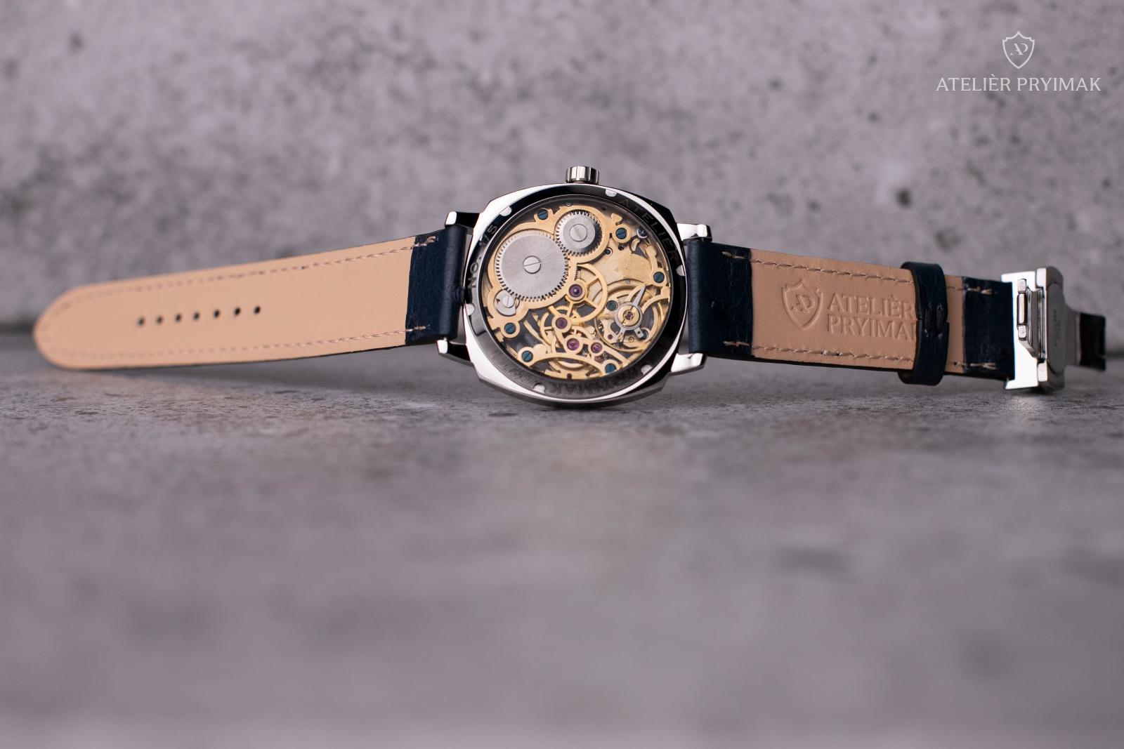 Uvnitř hodinek pracuje ručně skeletonizovaný a gravírovaný strojek ETA 6497 s pozlacenou úpravou, upravený našimi hodináři do regulátorového stylu typického pro Ateliér Pryimak. Otevřená konstrukce odhaluje rytmus mechaniky i ruční práci, která dává každému kusu nezaměnitelný charakter.