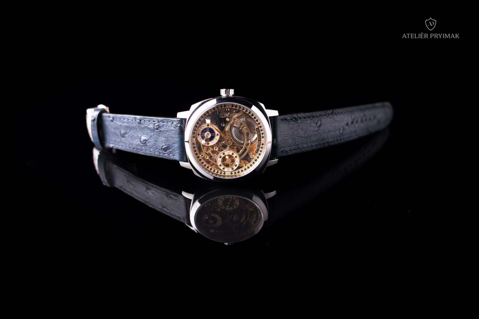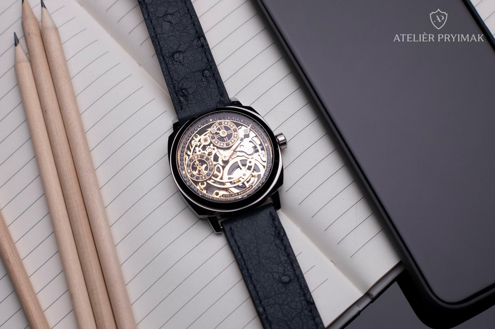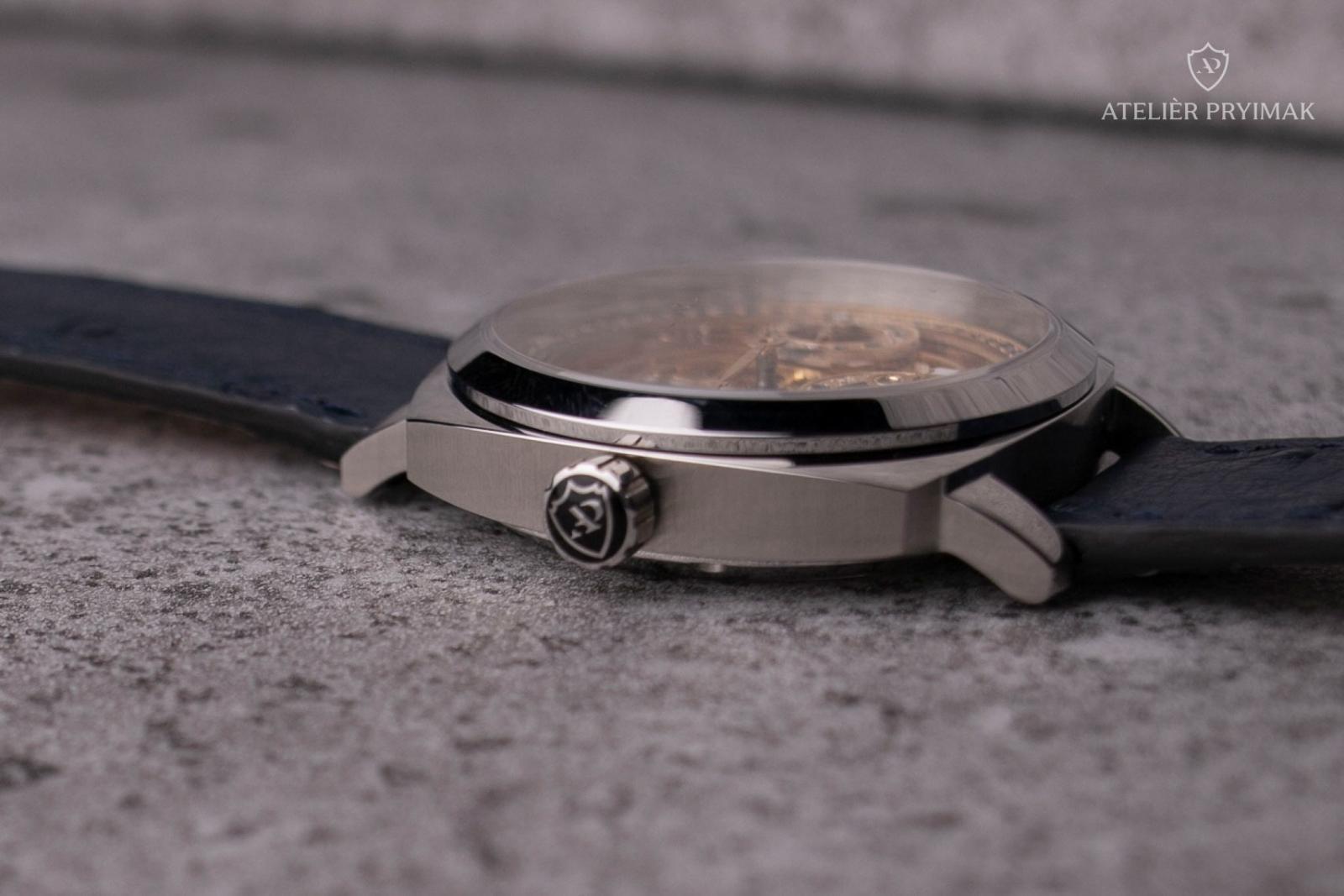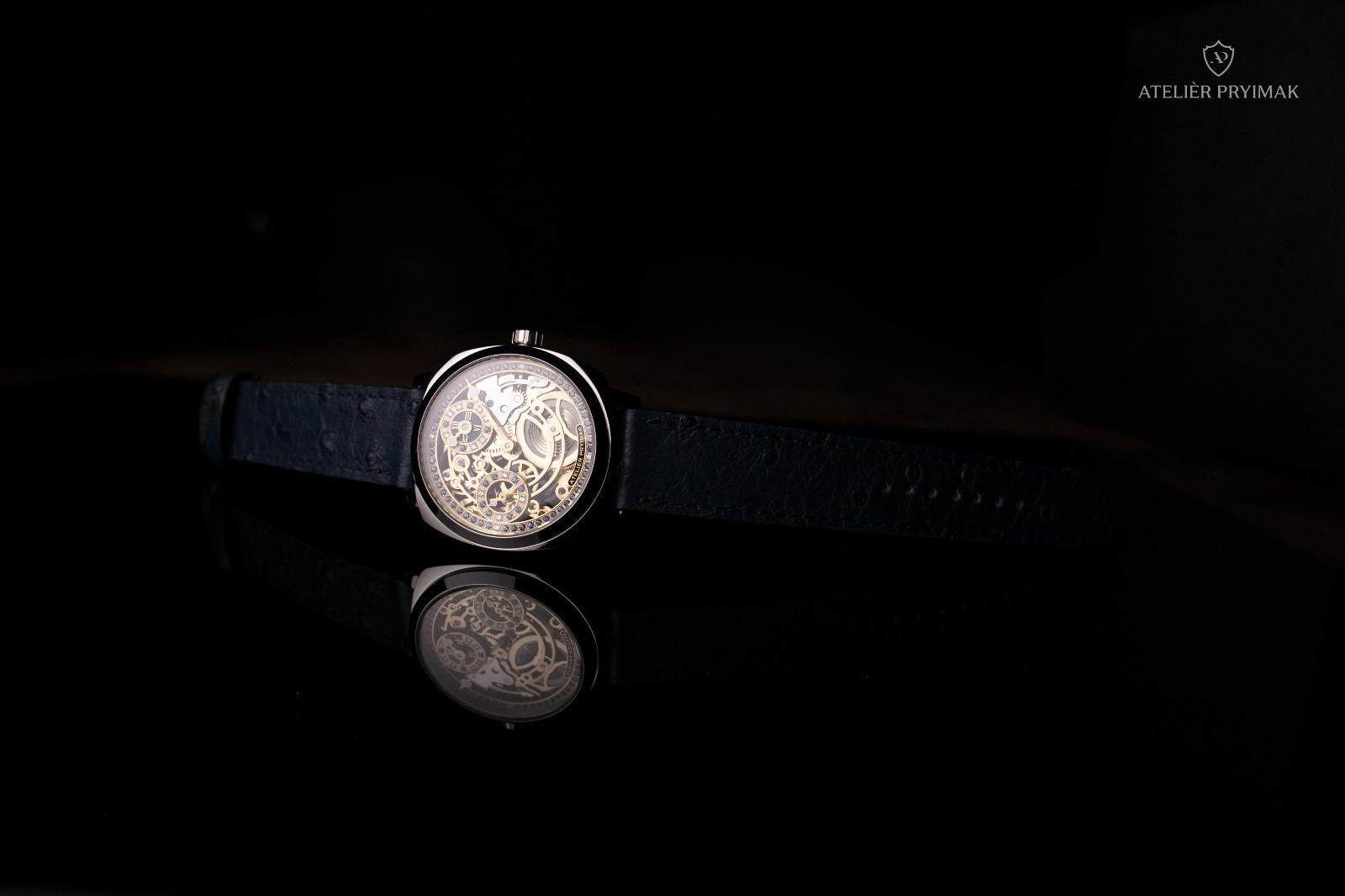 Uvnitř hodinek pracuje ručně skeletonizovaný a gravírovaný strojek ETA 6497 s pozlacenou úpravou, upravený našimi hodináři do regulátorového stylu typického pro Ateliér Pryimak. Otevřená konstrukce odhaluje rytmus mechaniky i ruční práci, která dává každému kusu nezaměnitelný charakter.