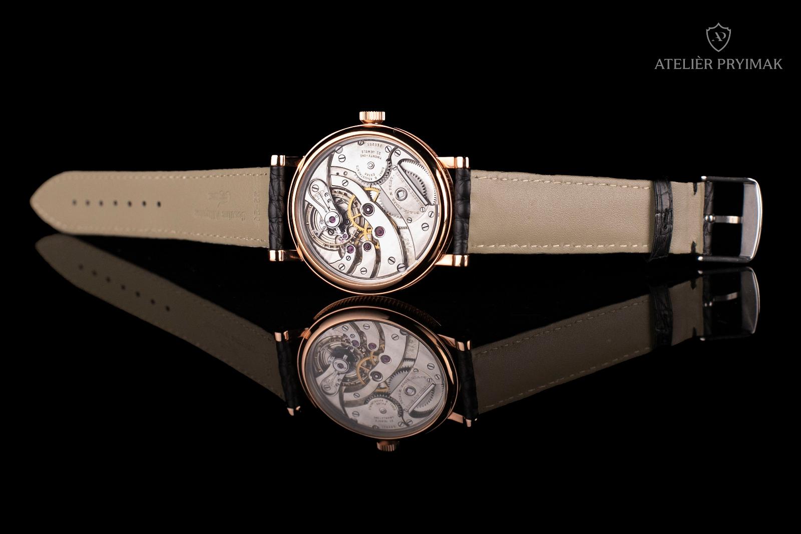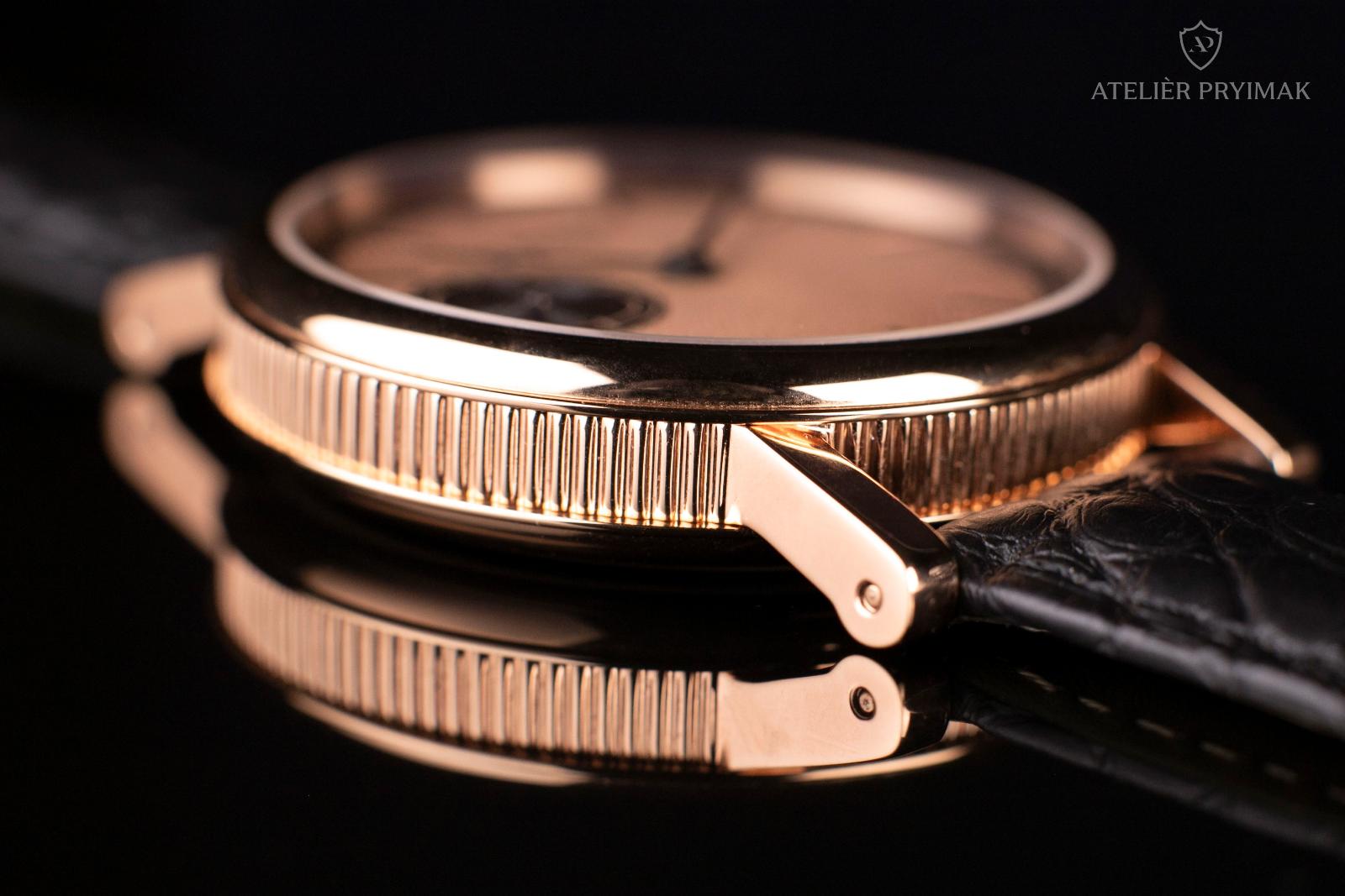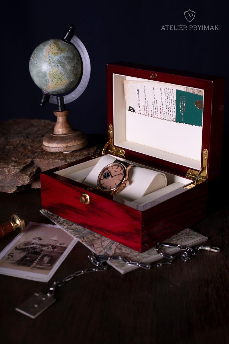 Speciálně pro tyto hodinky bylo v našem ateliéru vyrobeno pouzdro z nerezové oceli s PVD ROSE GOLD zlacením, které harmonicky doplňuje celkový vzhled a nese v sobě historický charakter celého díla.