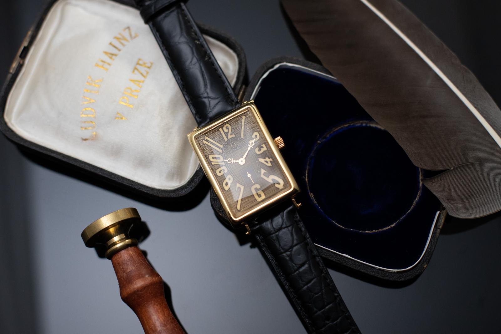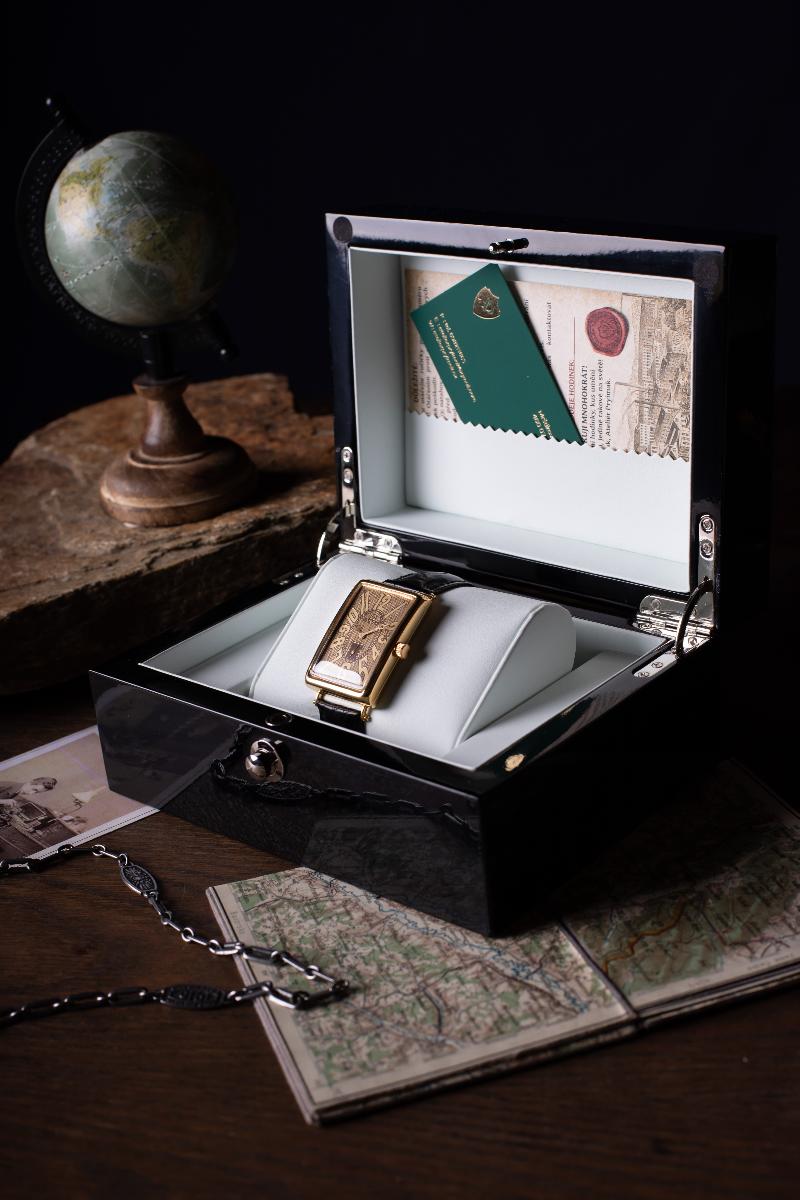 V našem ateliéru specialně pro tyto hodinky bylo vyrobené nové pouzdro o rozměru 44x31mm z mosazi s povrchovou úpravou zlacením což zajišťuje hodinkám luxusní vzhled a tradiční jedinečnost.